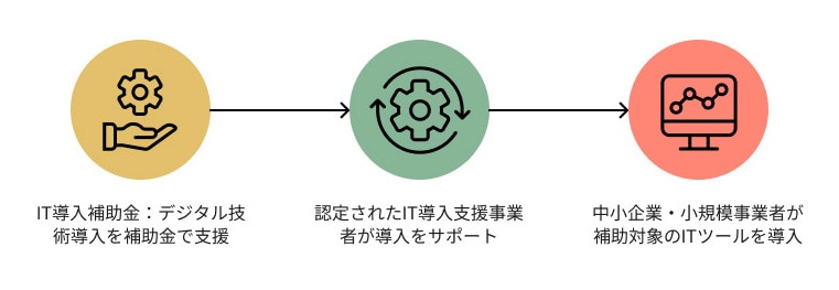 この補助金制度では、申請者が自社の経営課題や目標に合ったITソリューションを導入できるよう、審査を通過した「IT導入支援事業者」が選定され、導入までをサポートします。